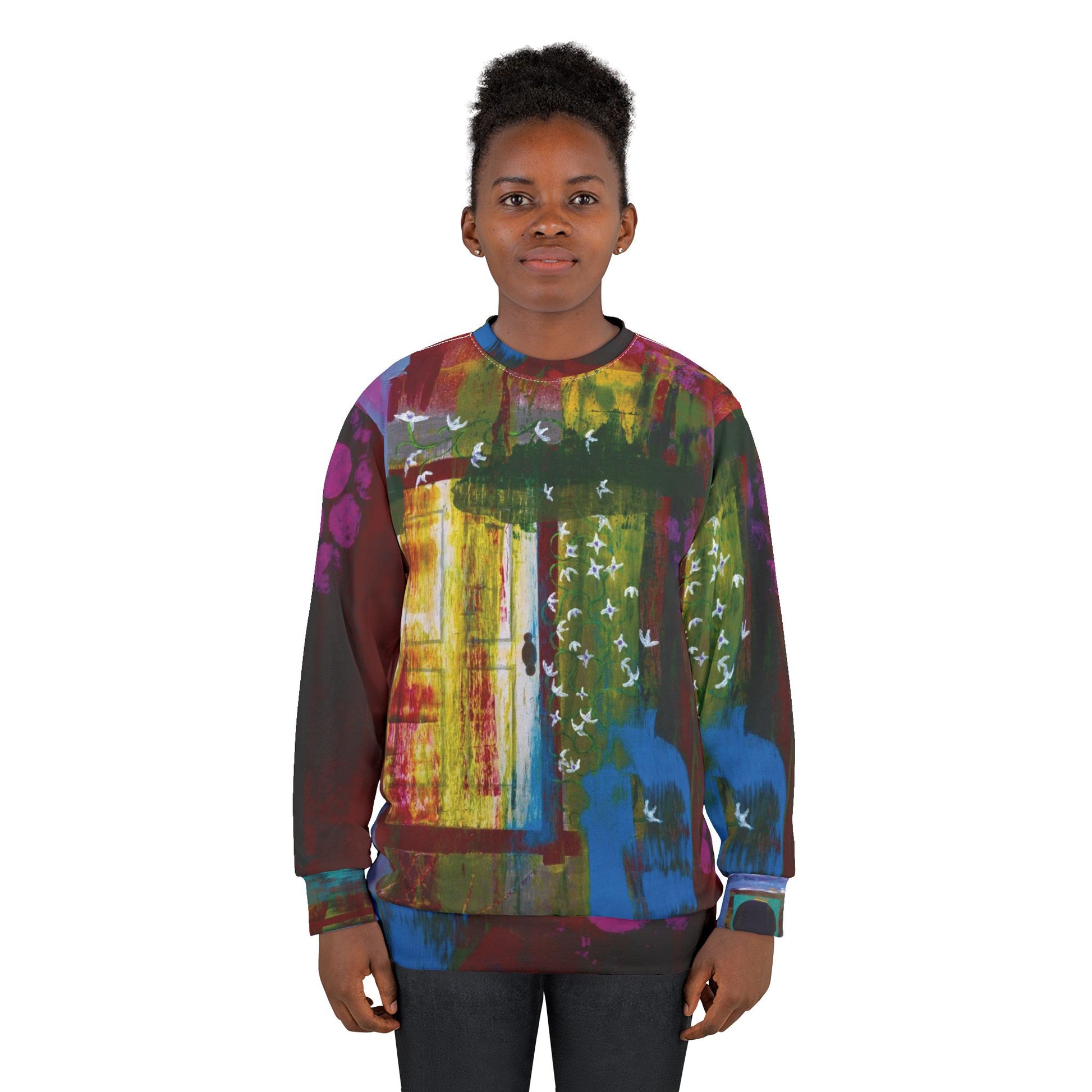 Wrap yourself in color and cosmos. This crewneck brings a bold, all-over celestial print to a classic sweatshirt silhouette — bright, saturated hues that don’t fade into the background. It feels substantial without being heavy, holds its shape, and moves with you thanks to ribbed-knit cuffs and collar with a touch of spandex. The medium-weight polyester keeps the print vivid and dries quickly after wear, while the custom cut-and-sew construction ensures the artwork lines up across seams. Wear it when you want to stand out during late-night studio sessions, rooftop gatherings, or slow mornings with coffee and a record player. It’s a sweatshirt that reads like a personal statement: loud, artful, and made to last.
